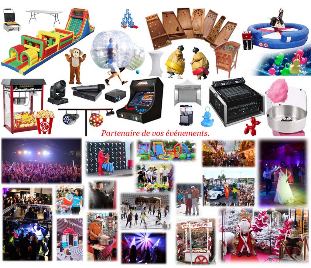 Sono, jeu de lumière, borne à selfie, jeux en bois, pêche au canard, vidéo projecteur, machines professionnelles sucrée ou salée, Mobilier, barnum, structure gonflable, etc..