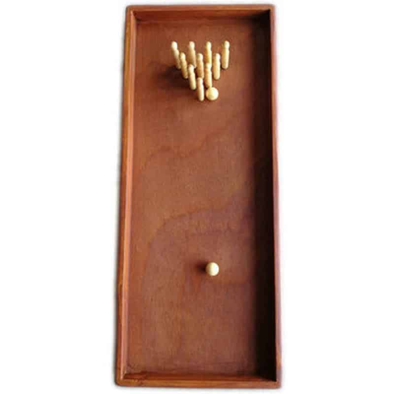 La formule comprend 1 bowling de table, 10 quilles en bois, 2 boules en bois, 1 régle du jeu.
