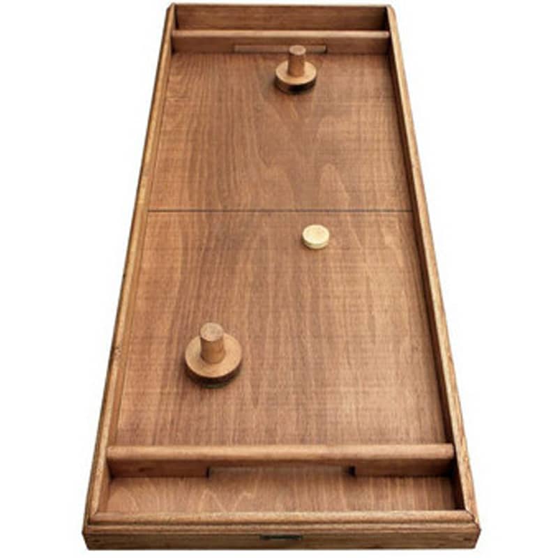 La formule comprend 1 table à glisser, 2 poignées en bois, 1 palets en bois, 1 régle du jeu.
