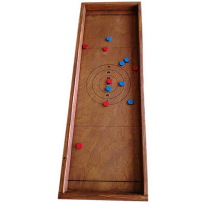 Voici un jeu en bois qui demandera de la précision et un bon dosage dans la force du tir. Le Tir sur cible est un jeu accessible à tous, les règles sont simples à comprendre, il s’agit de faire le plus haut score en se rapprochant le plus possible du centre de la piste, cependant attention rien n’est acquis puisque vos adversaire peuvent vous bousculer à tout moment, les parties sont donc pleines de rebondissements.
